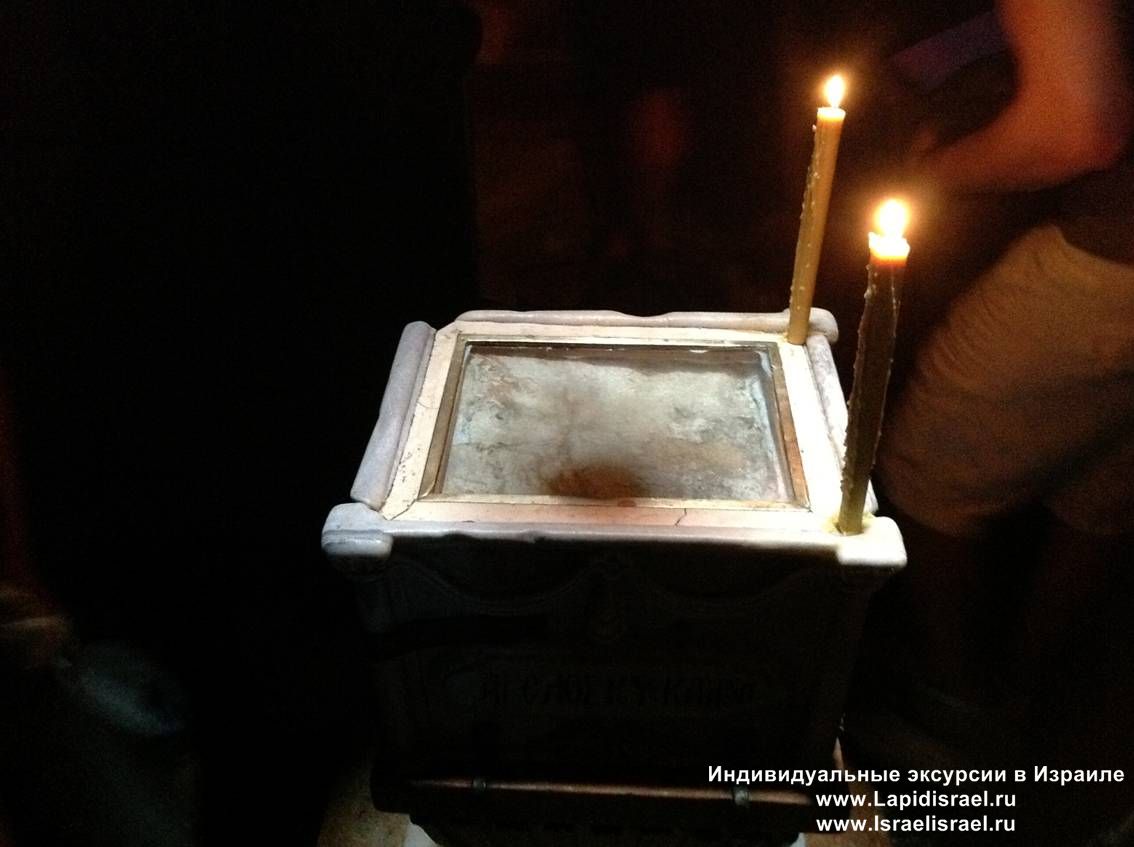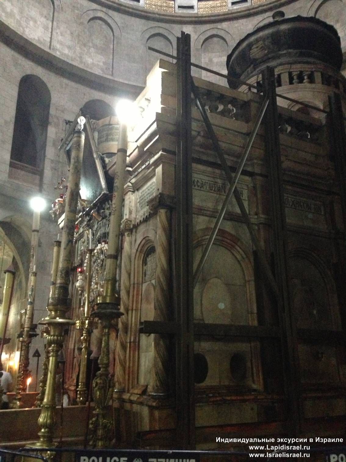 Гроб Господня Кувуклия в храме Воскресения в Иерусалиме. Самое святое и самое важное место для всего христианского мира в храме Воскресения - это непосредственно - то самое место, куда было положено тело Иисуса для дальнейшего его перезахоронения, и откуда он воскрес. Гроб Господня называется словом Кувуклия. После снятия Иисуса с распятия его тело было омыто благовониями и положено в пещеру, которая являлась просто быстро найденным подходящим местом. Почему тело не захоронили сразу, потому что все были евреями как Иисус, так и апостолы, а у евреев не принято хоронить с пятницы на субботу. Этот день был именно пятницей перед заходом субботы, когда происходила казнь. Римские власти с терпимым уважением относились к евреям и иудаизму, и поэтому непосредственно сам Понтий Пилат разрешил закончить казнь, убедившись, что все мертвы и снять тело Иисуса с распятия. Когда тело Иисуса кладут в пещеру, его тело было завёрнуто в саван, после апостолы выходят из пещеры и закрывают грот большим камнем. Из самой пещеры происходит чудо воскресения, которое не было замечено никем и без того чтобы камень был отодвинут. Очень важно понять, что Иисус воскрес как физически, так и духовно, поэтому в самом гроте остался саван, в котором было завёрнуто тело Иисуса, и отсюда идёт та самая знаменитая Туринская плащаница. В самой Кувуклии сегодня есть две маленькие комнаты, в которые может поместиться максимум 4 человека. Первая комната называется предел ангела, поскольку когда апостолы подошли к пещере на отвалённом камне сидел Архангел Гавриил и известил апостолов о том, что Иисус воскрес и сказал, чтобы они не искали живого среди мёртвых тело, вы здесь не найдёте, и апостолы прошли во вторую комнату, которая называется Гроб Господень, откуда Иисус воскрес, оставив, только саван. В первой комнате в пределе ангела можно увидеть под стеклом камень, отвалённый от пещеры на котором сидел Архангел Гавриил. Во второй комнате находиться плита, на которой лежало тело Иисуса, и с которой он воскрес. Сама Кувуклия много раз видоизменялась по истечению тех или иных обстоятельств, но то строение, что мы видим сегодня очень сильно пострадало сперва от пожара, и после от землетрясения, и когда купол храма, который был деревянный, падает на часовню сильно разрушая её. После были произведены реконструкции купола, который называться Ротонда, и он был сделан из бетона. Через витраж Ротонды проходит солнечный луч, который пронзает всю главную часть храма Гроба Господня. На куполе изображены 12 лучей, который символизируют 12 апостолов, и у каждого луча есть три наконечника, которые символизируют святую троицу. Из Кувуклии Гроба Господня каждый год по НТВ, у которых эксклюзивные права на ретрансляцию, вы можете видеть схождение благодатного огня. В Гроб Господня заходят два первосвященника армянский и православный. Армянский первосвященник остается в первой комнате, а греко православный первосвященник заходит во вторую комнату, и непосредственно на свечи православного первосвященника сходит благодатный огонь. Если заметить, то по бокам Кувуклии есть овальные отверстия, и тот, кто просовывает туда руку со свечами, тот и выносить первый благодатный огонь, зажженный от свечей первосвященника, который находиться ещё внутри Кувклии. После священник выходит из Гроба Господ